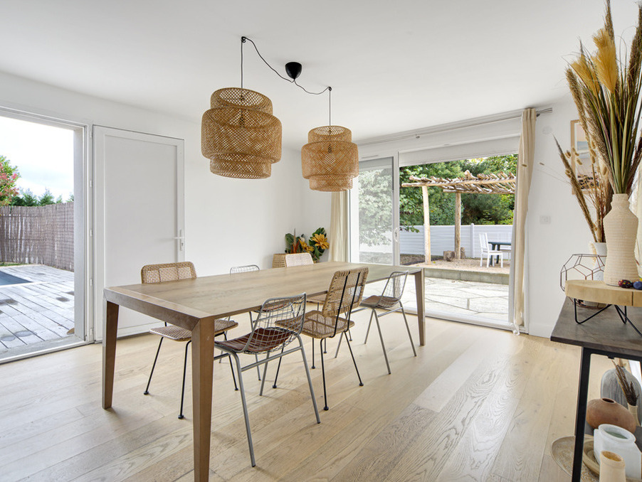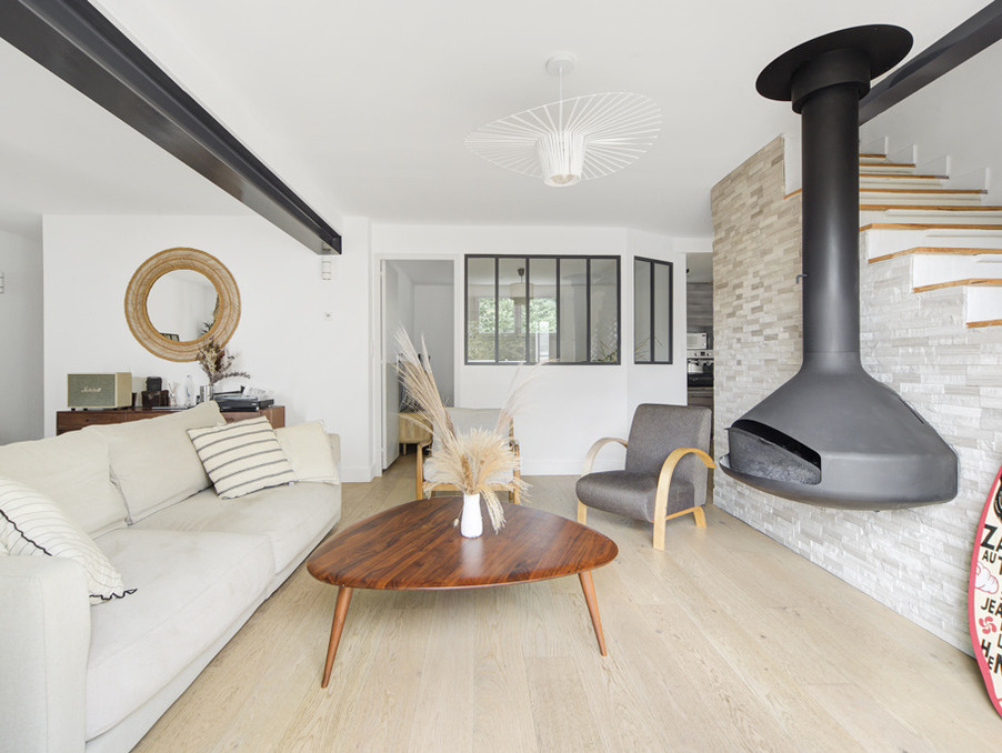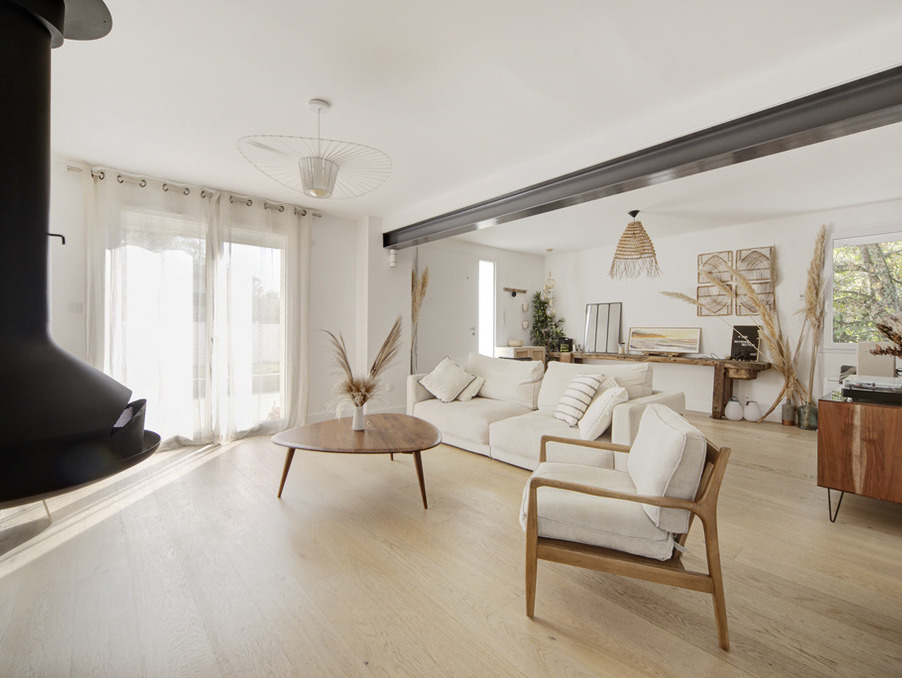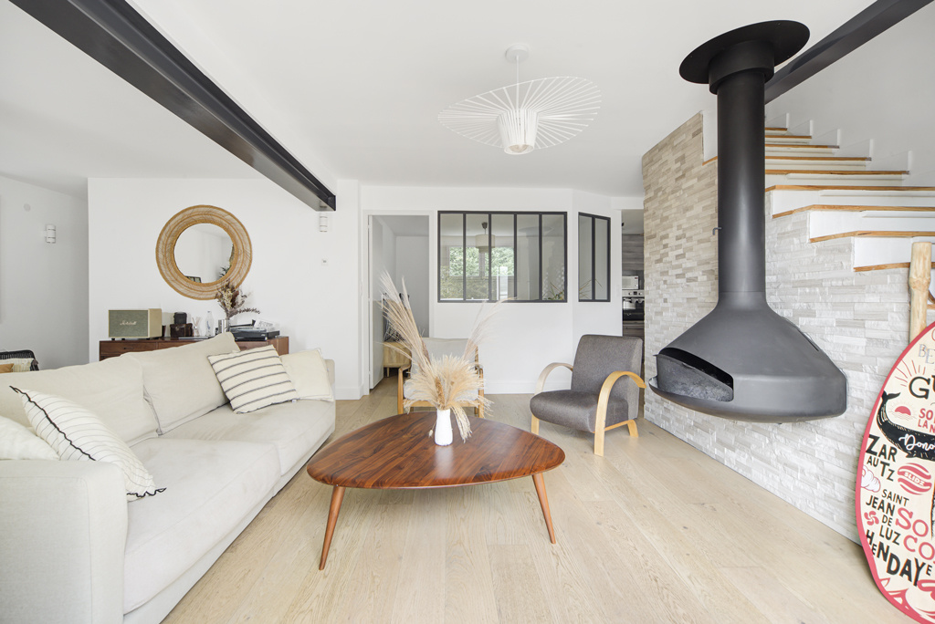 Elle se compose d'un superbe espace de vie très chaleureux de 80 m2 comprenant, séjour avec cheminée suspendue, coin TV, salle à manger avec cuisine américaine, cellier et wc au rez de chaussée.