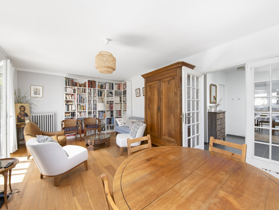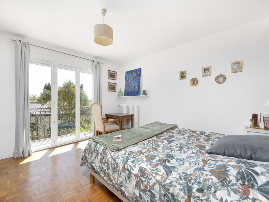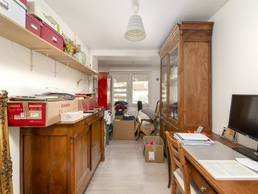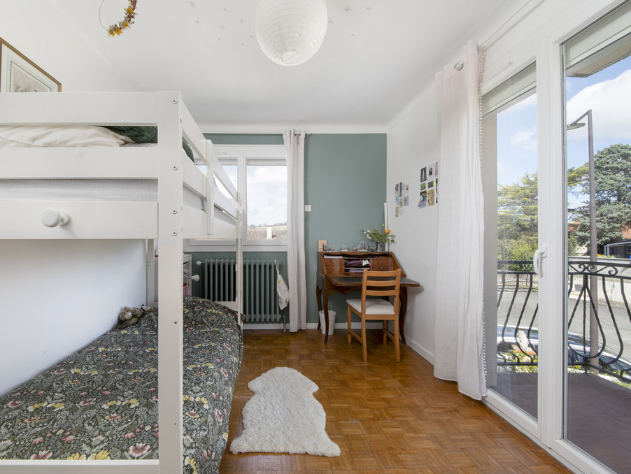 un bureau, de 4 chambres avec balcon, deux salles d'eau et 2 wc. Un espace de rangement supplémentaire existe dans les combles.