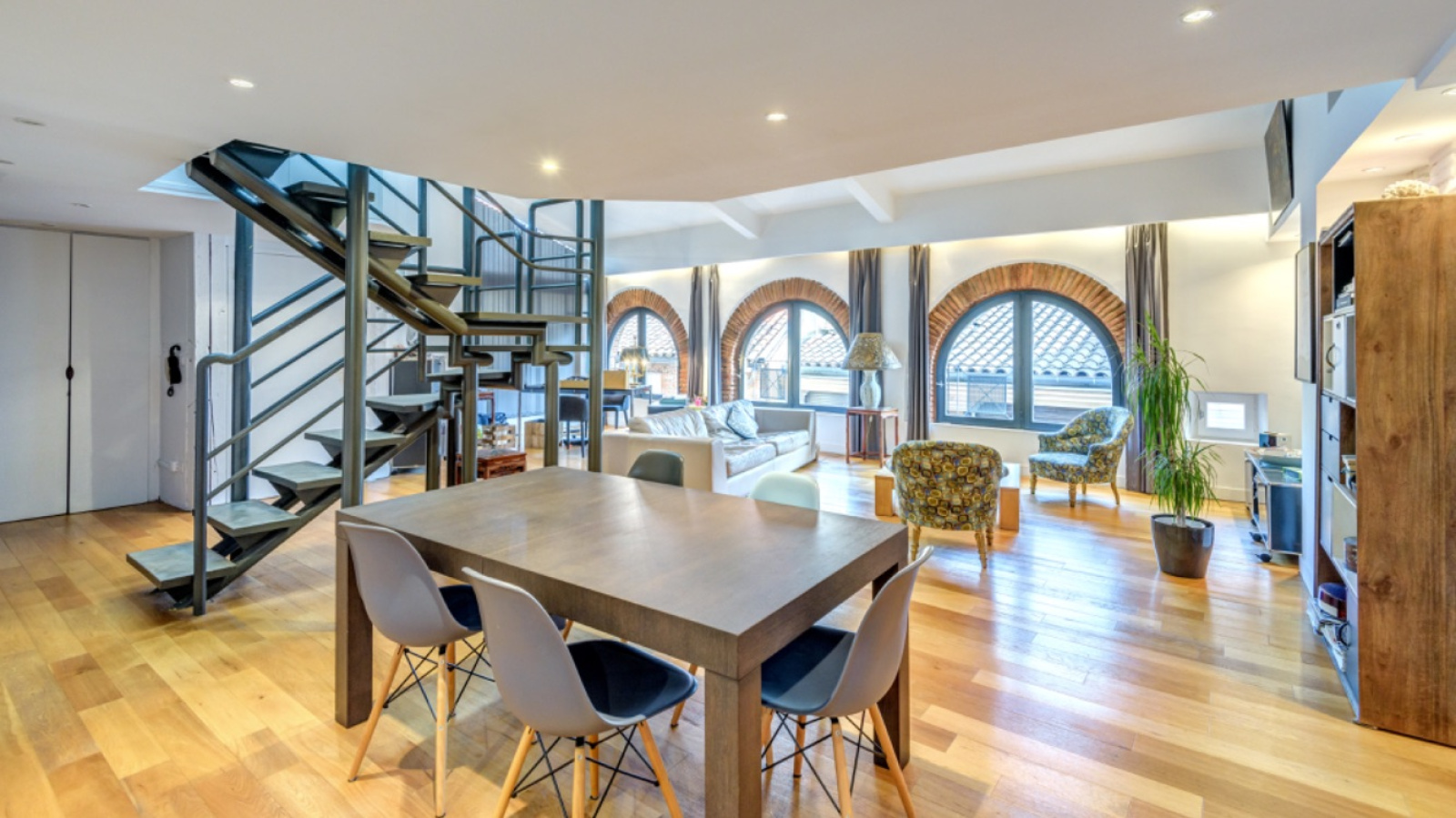 Spacieux Séjour cathédrale traversant de 60m² avec coin bureau, Cuisine americaine et chauffage au sol