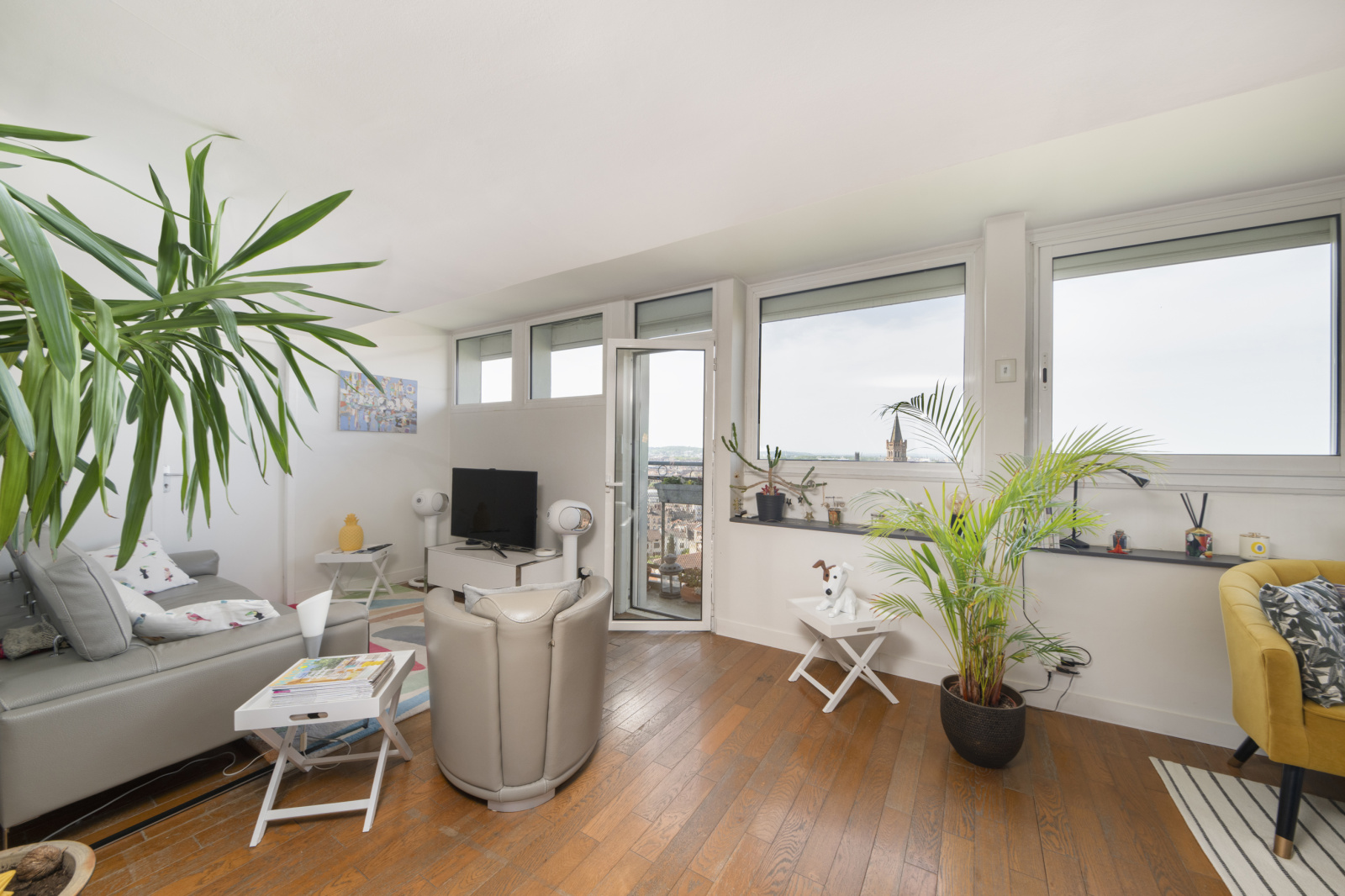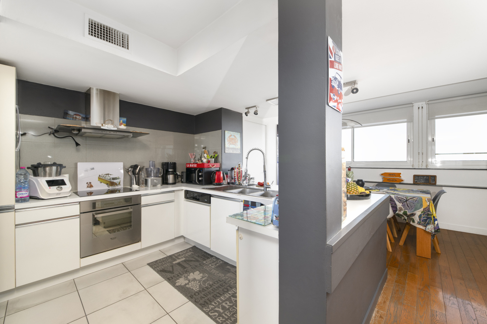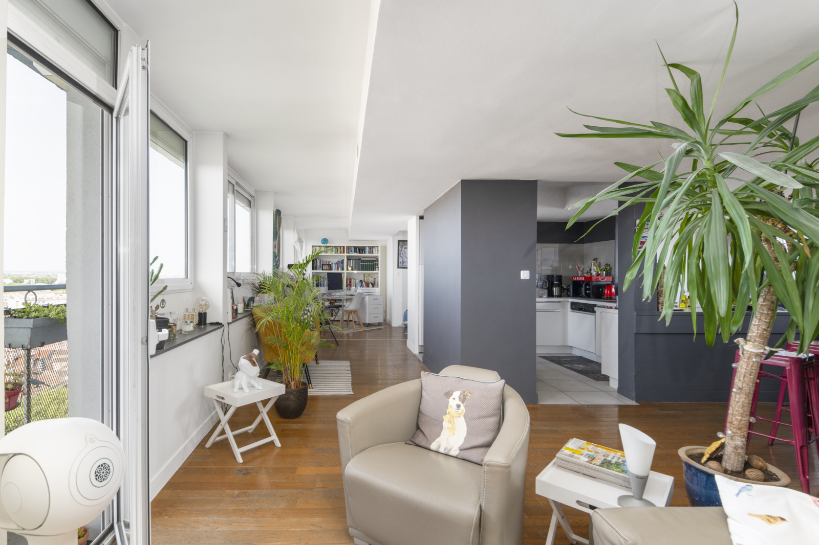 Agencement fonctionnel totalement ouvert sur balcon filant.