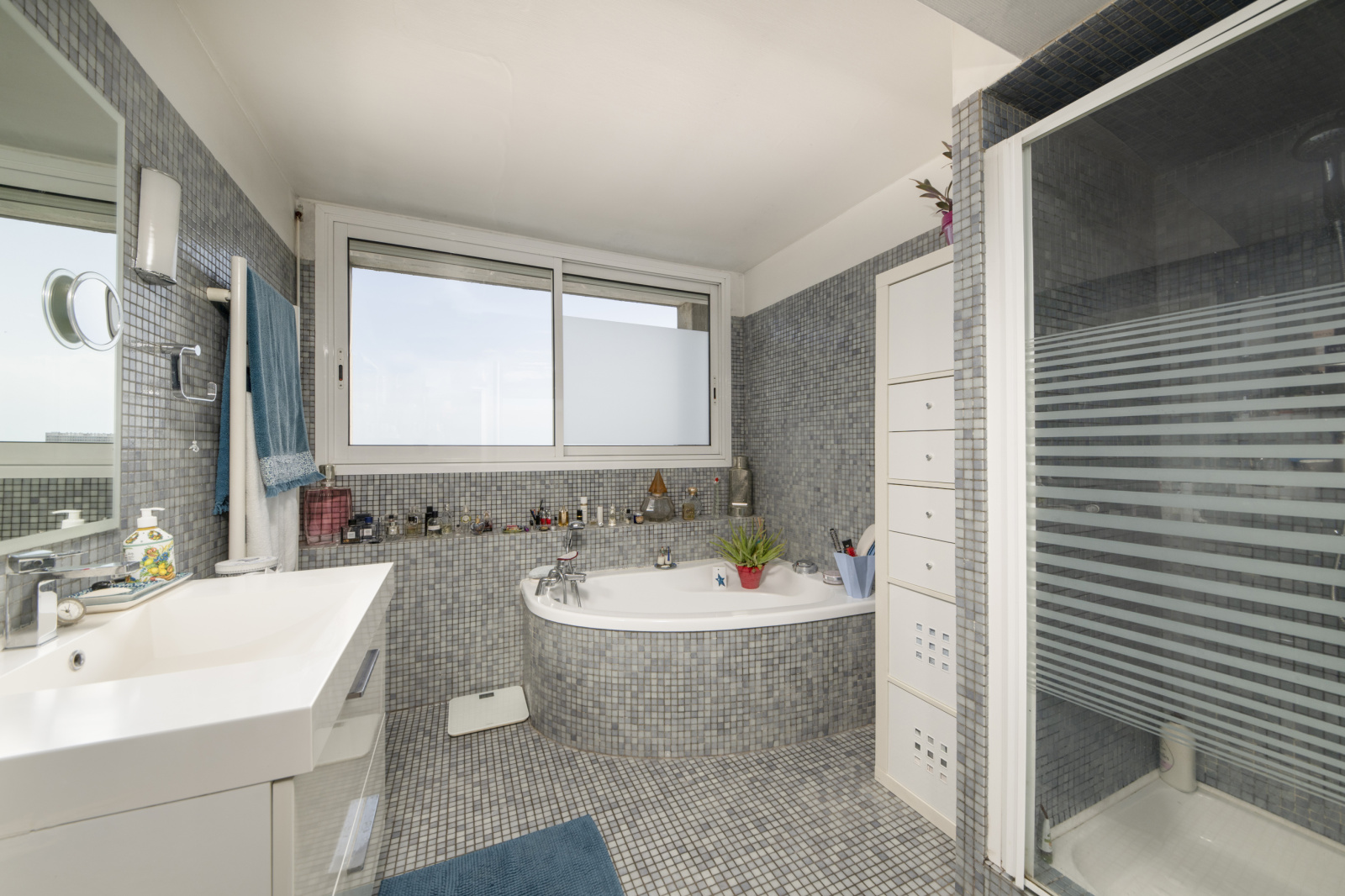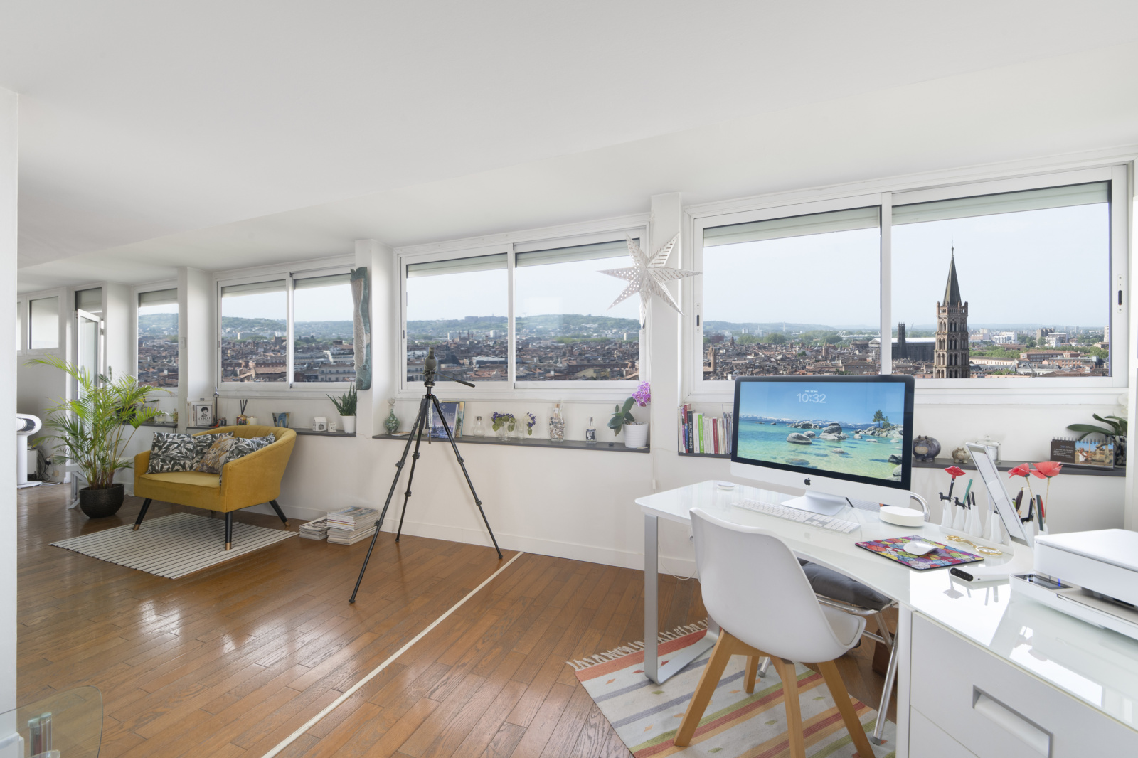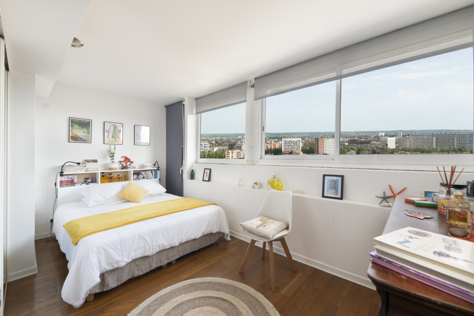 Agencement fonctionnel totalement ouvert sur balcon filant.