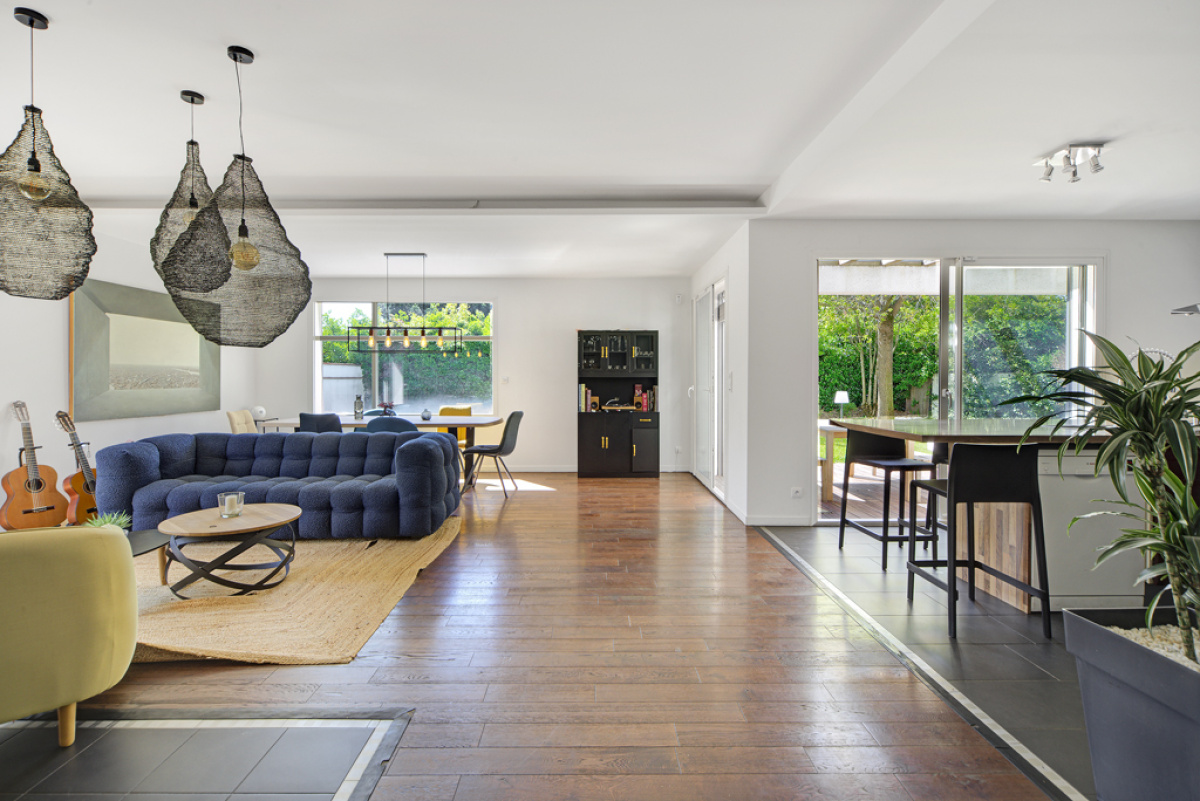 Au rez de chaussée, une spacieuse pièce de vie de 65 m² se décline entre séjour -salle à manger et cuisine. De grandes baies vitrées agrémentent cet espace chaleureux qui s'ouvre sur un jardin aménagé avec soin, doté d'une terrasse, d'une pergola et d'une piscine.