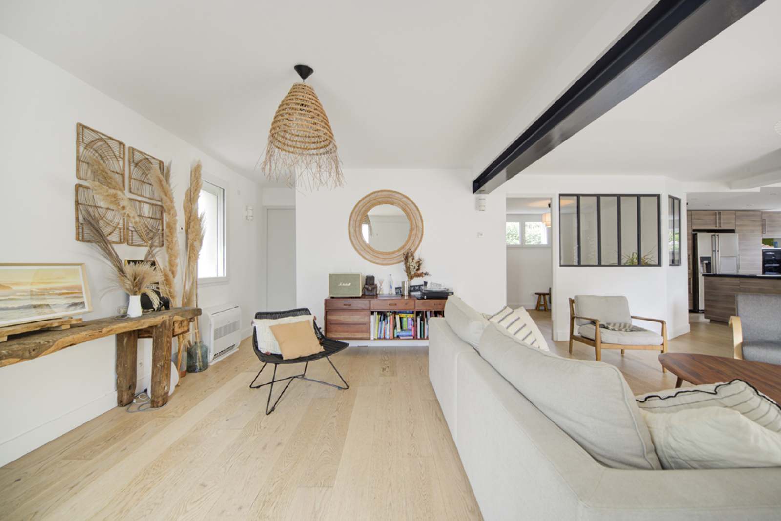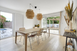Elle se compose d'un spacieux espace de vie très chaleureux de près de 80 m² comprenant, séjour avec cheminée suspendue, coin TV, salle à manger avec cuisine américaine, cellier et wc au rez de chaussée.