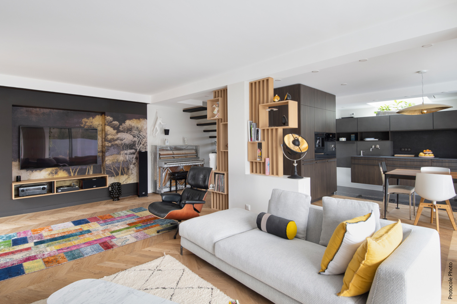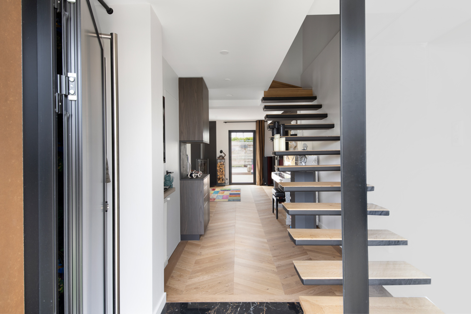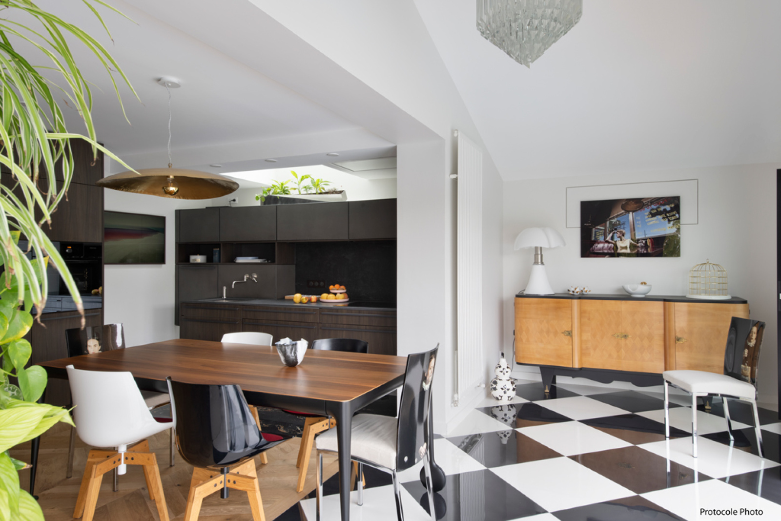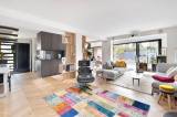La villa se compose en RDC d'une entrée avec dressing et WC japonais, un salon/séjour de 80 m2 avec cuisine aménagée sur mesure de marque LEICHT haut de gamme, entièrement équipée avec des appareils électoménagers de marque : four multifonction à vapeur et cafetière intégrée V-ZUG, frigidaire congélateur LIEBHERR, lave-vaisselle MIELE, plaque induction et hotte NOVY + une suite parentale de 35 m2 offre l'accès direct aux terrasses, un dressing aménagé, une magnifique SDE avec douche italienne + une pièce magnifique de 35 m5 communicante, servant actuellement de local professionel avec coin laverie-cuisine et WC avec son entrée indépendante et son jardinet privé + un garage de 25 m2 avec mezzanine et buanderie. Les parquets sont en bois chêne massif italien LISTONE GIORDANO, ainsi que l'escalier design montant à l'étage.