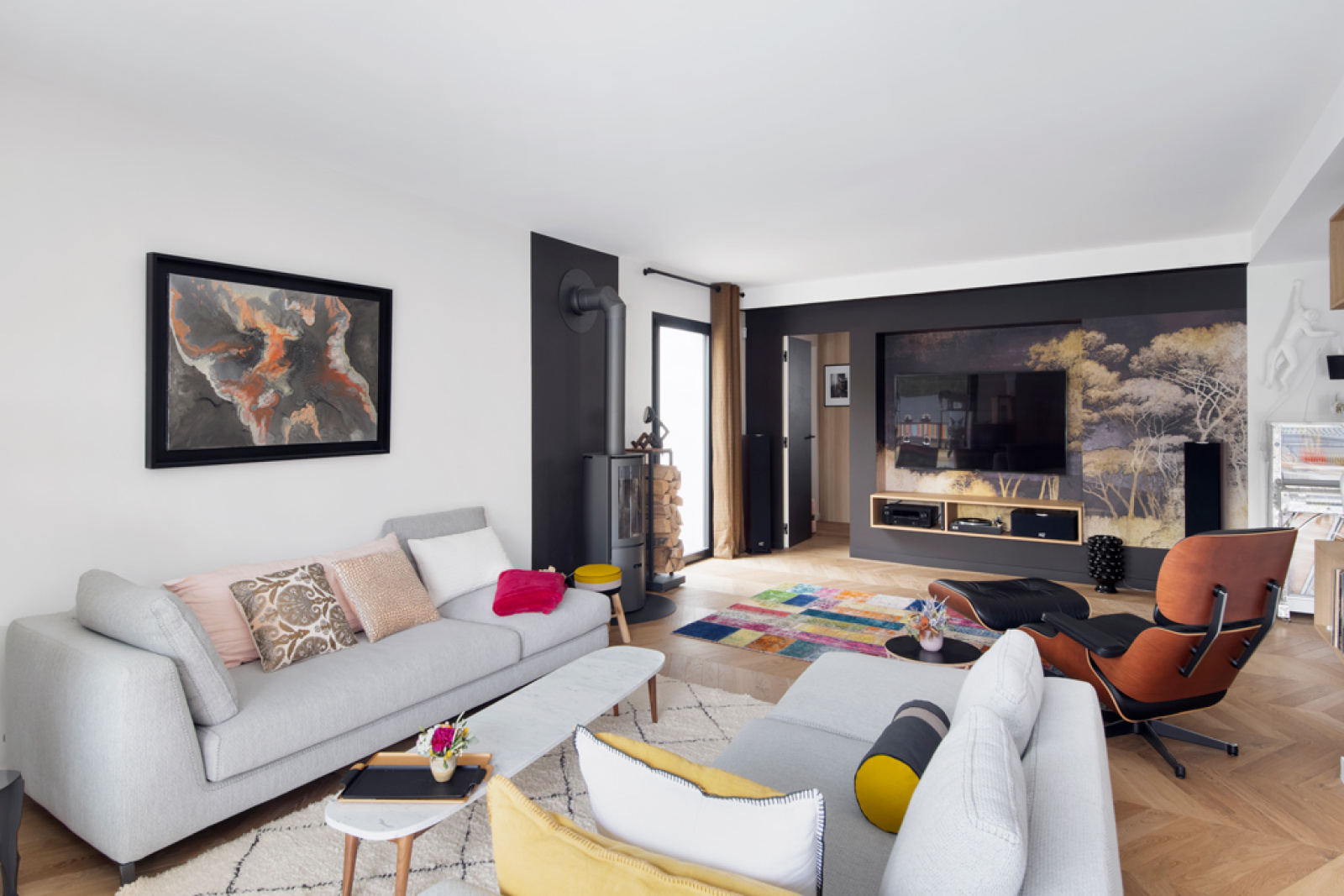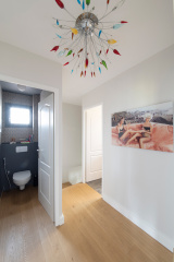 L'étage de 65 m2 hab comprend 3 ch. de 12 à 15 m2 avec dressings aménagés + 1 SDB + 1 WC indépendant. Le séjour/salon est équipé d'un rétroprojecteur de très haut de gamme avec écran rétractable, les marques réputées et de très haut de gamme assurent un confort et un fonctionnement de haute qualité.