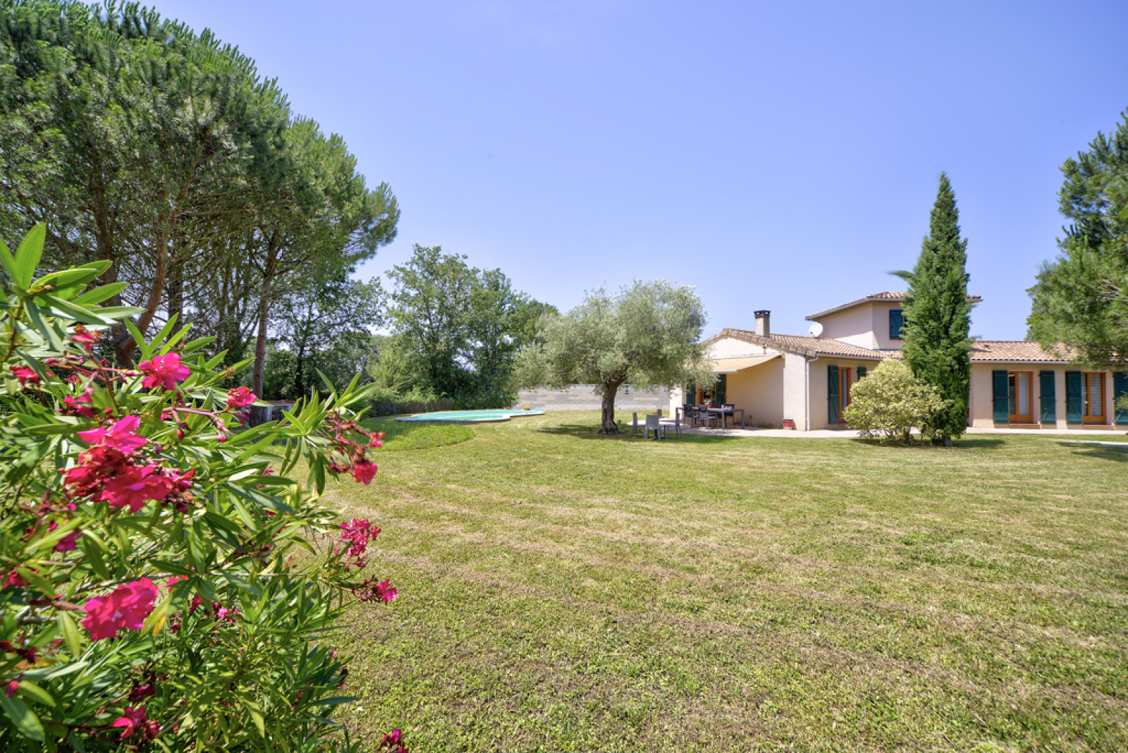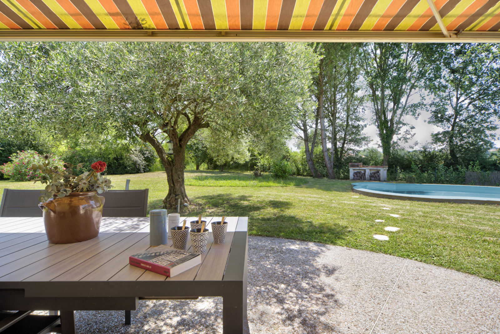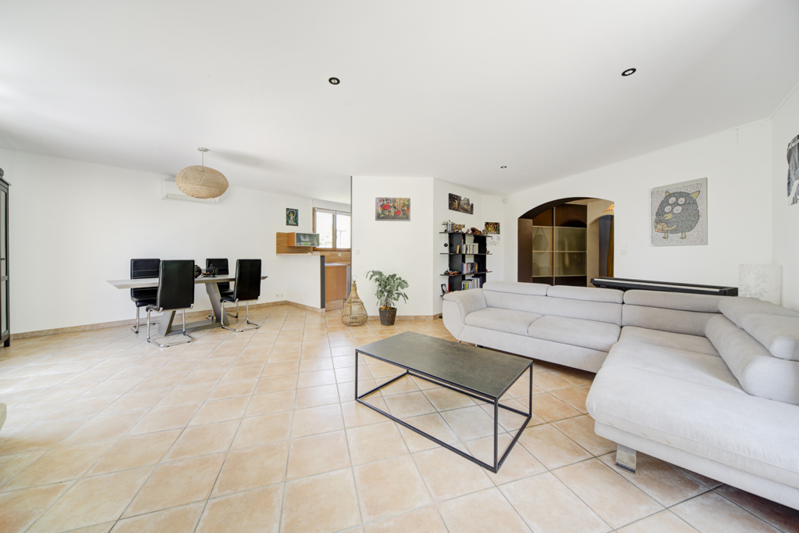 La maison se compose d'un spacieux séjour disposant d'une triple exposition. il ouvre sur une terrasse depuis laquelle vous aurez vue sur la piscine et le jardin.