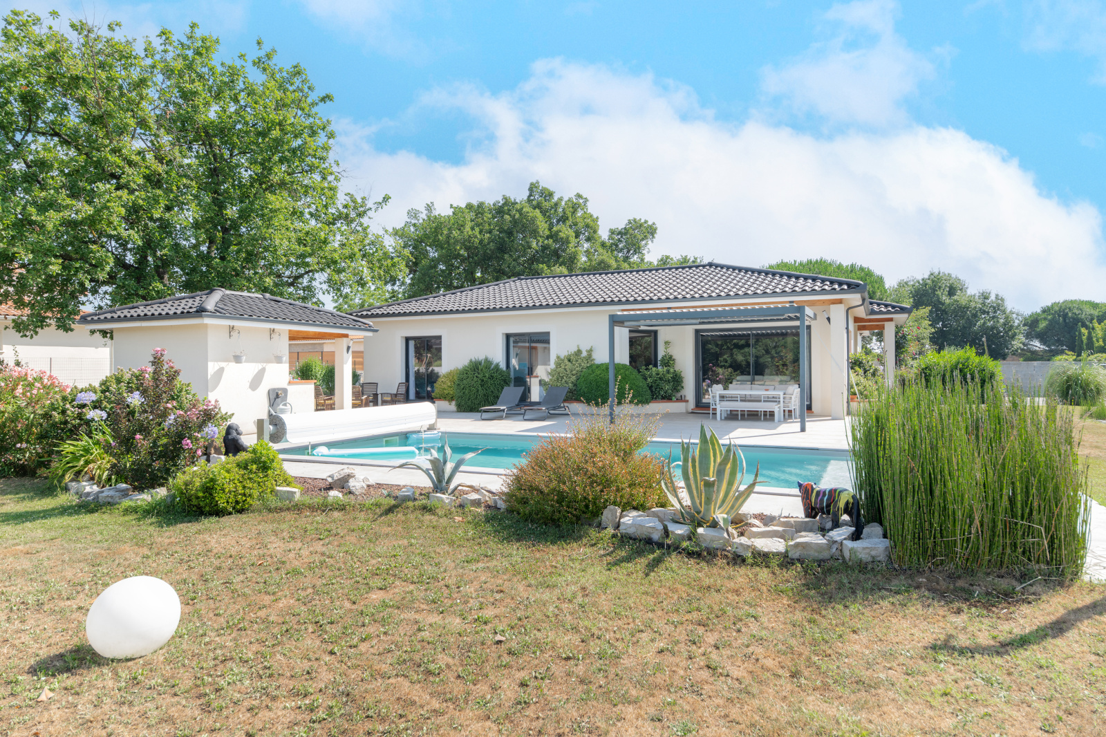 A l'extérieur, vous profiterez d'un vaste jardin paysagé de plus de 3 000m², sans vis-à-vis, d'une piscine 8x4m avec traitement au sel, d'un pool house et d'une pergola bioclimatique. Vous trouverez également un garage de 51m² et un abris supplémentaire.