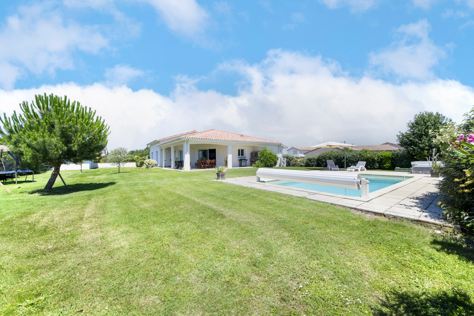 A l'extérieur, superbe jardin au calme, arboré et sans vis-à-vis avec piscine 8*4 (rideau de protection électrique).