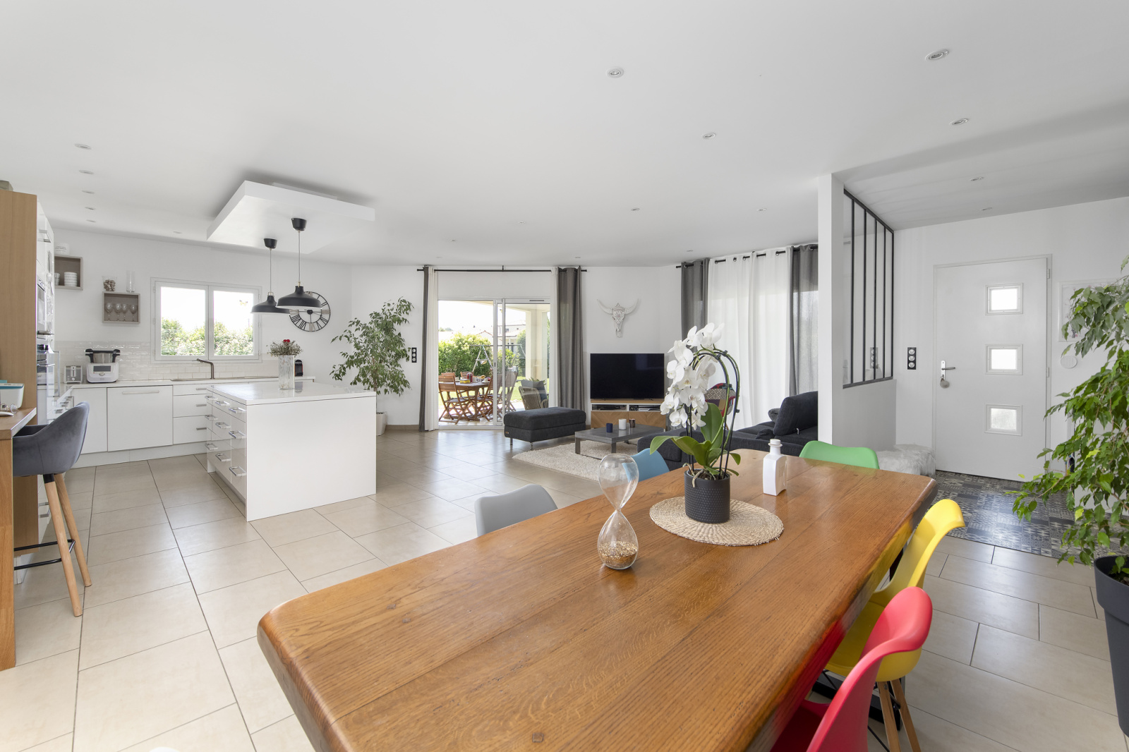 Un séjour lumineux de 60m² avec cuisine ouverte et donnant sur terrasse.