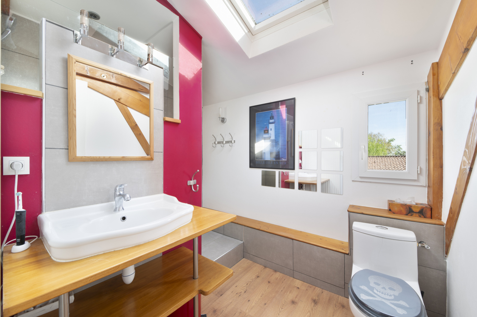 Au rez-de-chaussée, nous retrouvons également 2 chambres avec placards, une troisième chambre en retrait (idéale pour recevoir des amis par exemple) avec un accès direct à la terrasse, un bureau, une salle de bain ainsi qu'un WC séparé.
